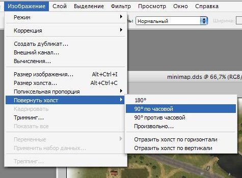 Осталось положить миникарту в папку с самой картой и посмотреть ее в редакторе. Если миникарта расположена не правильно, то смотрим – в какую сторону ее нужно повернуть. Чтобы повернуть ее опять заходим в Photoshop, открываем миникарту и поворачиваем ее в нужную сторону.