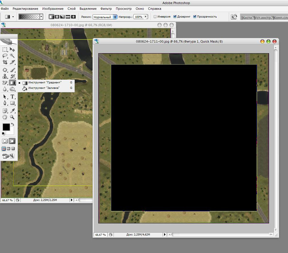 Выбираем основной слой (background) и заходим в режим быстрой маски (Q). Выбираем Gradient tool (G), зажимаем шифт и от границы изображения до прямоугольника растягиваем линию.