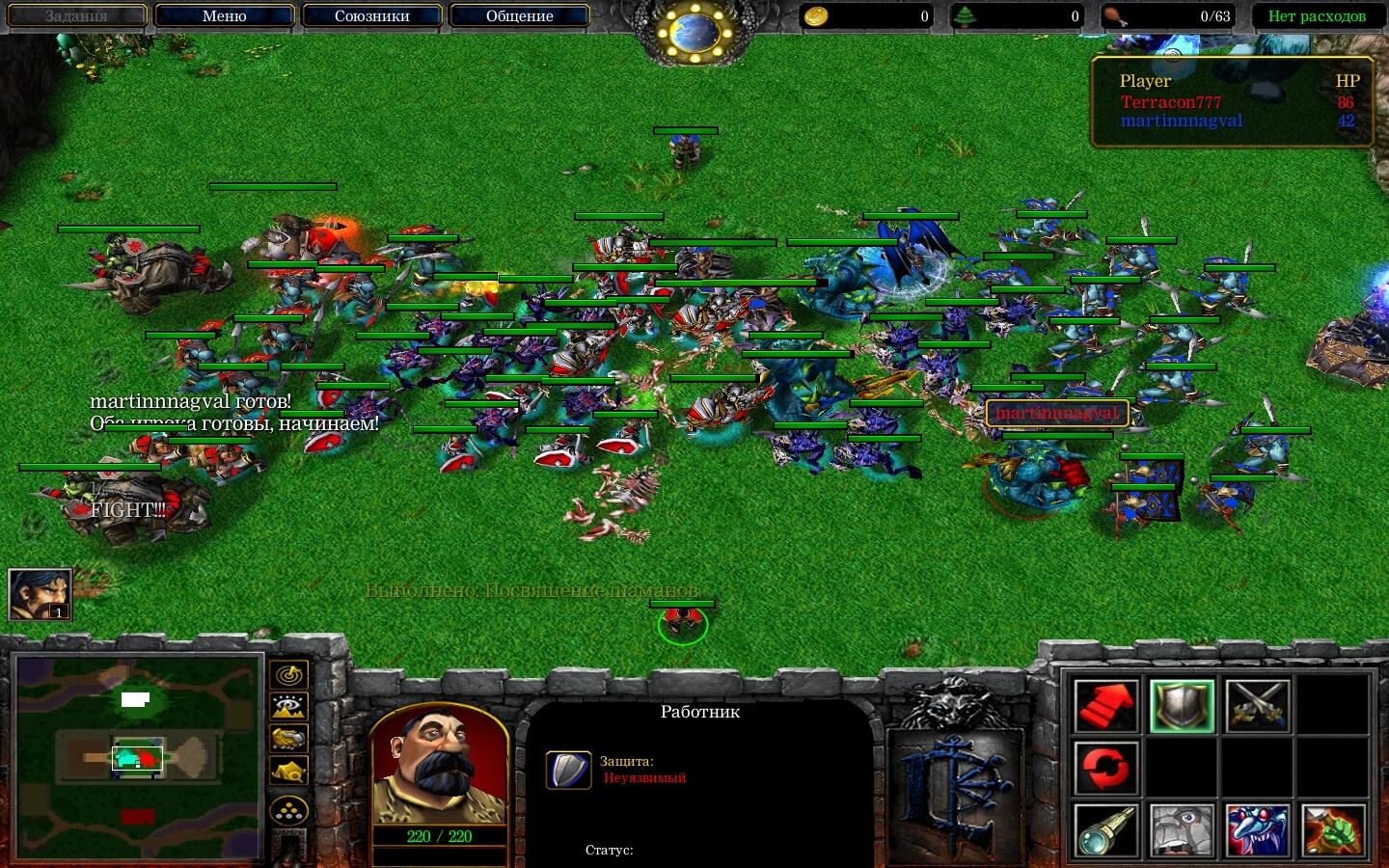 3. После покупки юнитов и/или улучшений, игроки сообщают о своей готовности, нажав на заклинание у работника, с названием "Я готов!". Внимание, не истраченное золото не сохраняется.