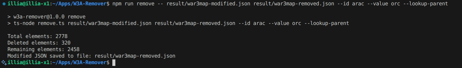 npm run remove -- .\war3map.json .\war3map-removed.json -- --rawcodes rawcodes.txt --id arac --value orc --lookup-parent