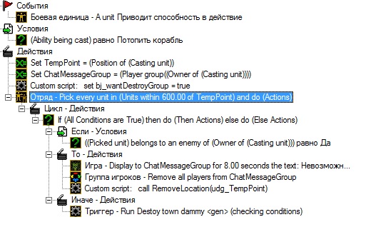 Простейший триггер. Убивает кастера, если рядом нет противников, но одновременно срабатывает и THEN и ELSE. Я как бы думал, что для этого и сделан иф, чтобы срабатывало что-то одно.