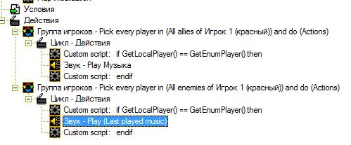 Есть мультиплеерная карта. Есть две команды. Когда выигрывает команда, триггер должен запускать музыку победы для выигравших и музыку поражения для проигравших. Я не могу так сделать, могу только включить общую музыку для всех игроков. Подскажите, пожалуйста, что делать...