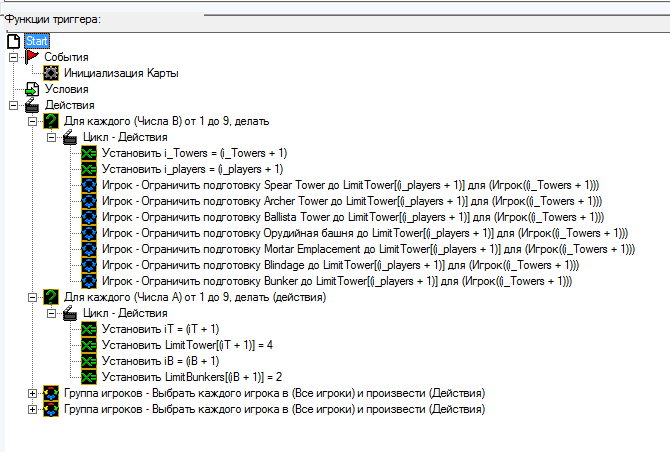 В данном триггере (если порядок поменять) в массиве целочисленной не вижу смысла, ибо всем игрокам (1-9) дается ограничение одно и тоже равное четырем. Можно было просто вместо массива целочисленной вписать 4 и радоваться оптимизации. Тоже самое касается целочисленной i_Towers, в ней тоже мы не нуждаемся, ибо можно было вместо