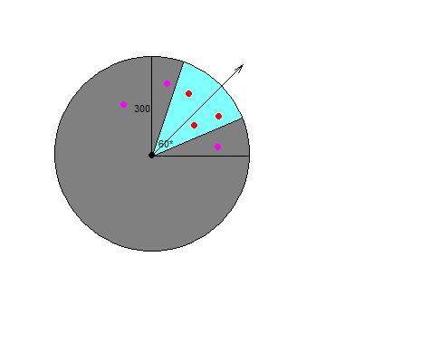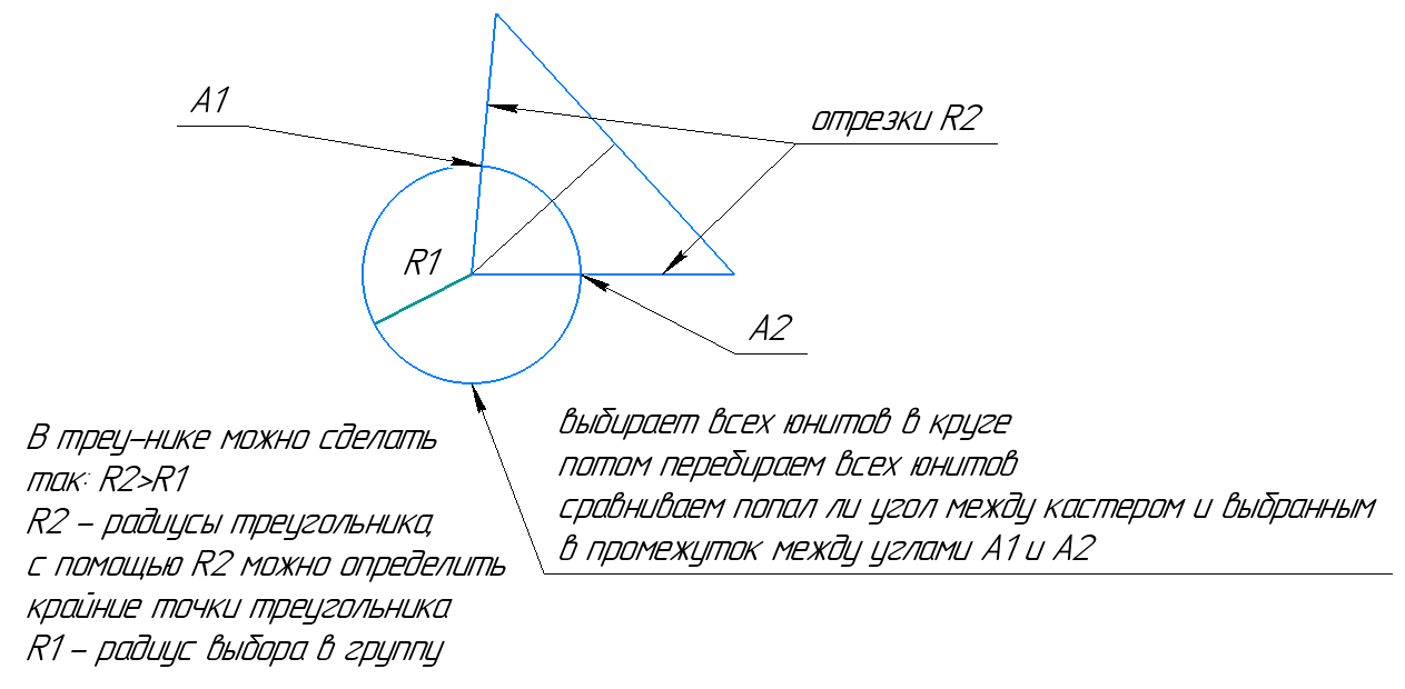 Проблема вот в чем, когда юнит начинает стрелять или кастовать в одного противника, можно определить вектор. Относительно этого сложно подобрать формулу подбора всех юнитов. Не силен в косинусах, синусах, тем более в полярных координатах. Приложен пример в картинке. Помогите.