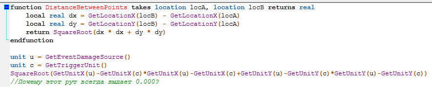 напоминаю о существовании IsUnitInRange(u1,u2,rng) и IsUnitInRangeXY(u,x,y,rng) для проверки расстояний между юнитом и точкой/юнитом. В большинстве случаев проверяют, входит ли юнит в аое, и эта нативка будет в разы быстрее, чем самописцы