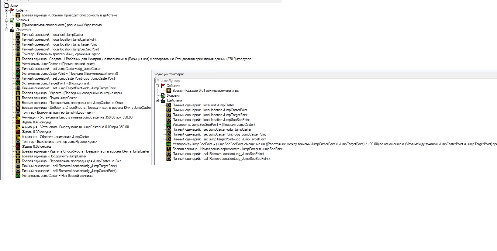 тут просто сложная система у тебя, так нагорожена и запутано. Я убрал лишнее и написал на jass. косяк в том, что между триггерами Jump и JumpFlyLoop есть ссылка (переменная), которую, видимо, перезаписывают. Также повторное использование другим юнитом перезапишет в Jump еще раз. Твои триггеры сложно было читать, все эти манипуляции локалками-глобалки, и наоборот, только путают. Где то в этих манипуляциях ты ошибся, раз не хотят опускать на землю. По логике их должно опустить после опр. времени (это после вэйта в Jump). Посмотрел бы как делаются прыжки на сайте. на хайве. Хотел недавно найти прыжок самурая-орка, когда в прыжке анимацию проигрывает, и показывает. что рубит сверху. Красиво сделано. Но не нашел (придеться самому делать), все время попадаются уродливые прыжки, особенно как у тебя (извини не хотел обидеть, просто прыжок не выглядит настоящим, реальным). гуи и муи много попадались.