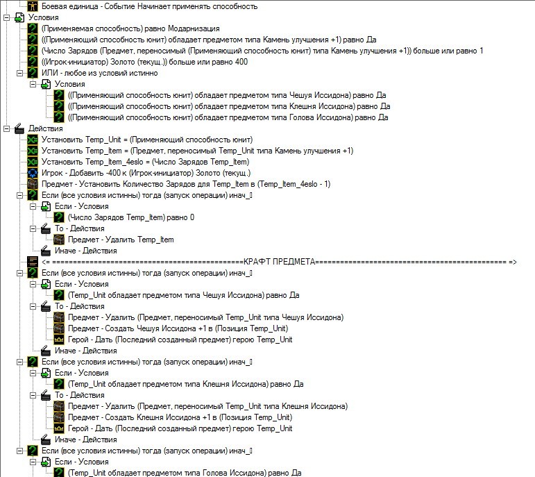 Создал триггер по принципу улучшения шмота как в многих ММОРПГ, как видно - что бы улучшить шмот, нужно 400 золотых и 1 камень улучшения, но если у героя сразу все 3 шмотки, то снимается как за 1 улучшения, подскажите как исправить?