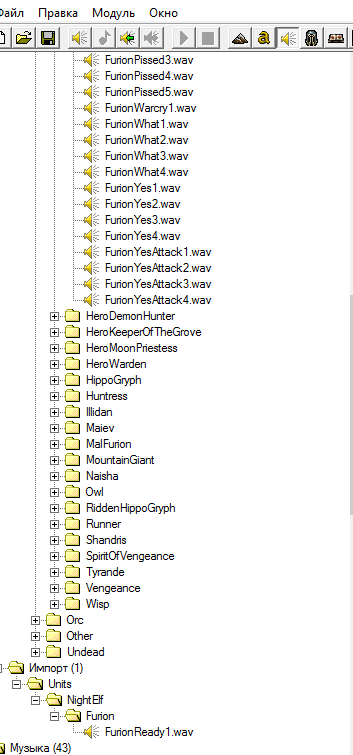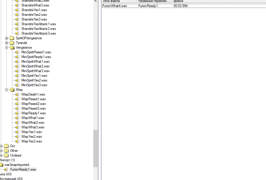 Тогда файл Units\NightElf\Furion\FurionReady1.wav будет проигрываться при создании и воскрешении этого героя.FurionReady | FurionReady1.wav | Units\NightElf\Furion\ | .............