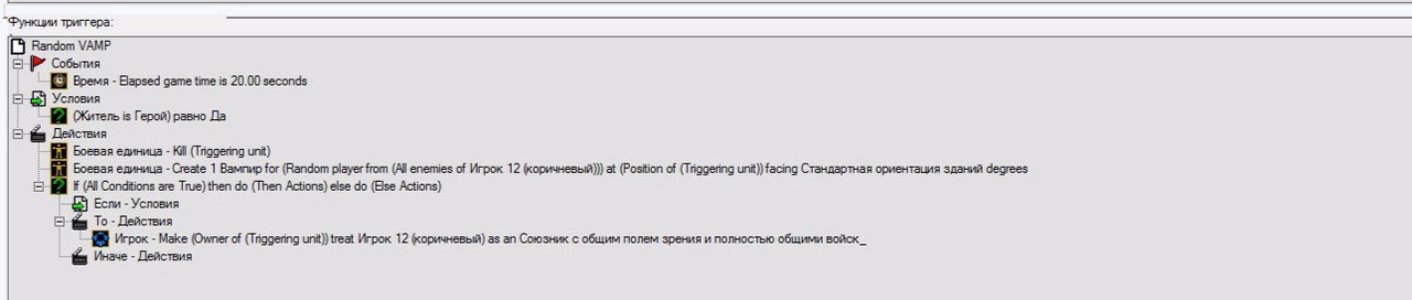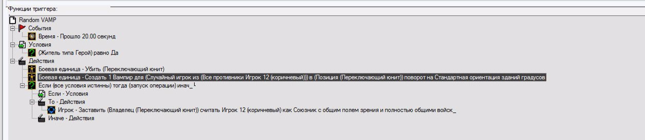 Сначала юнитам назначаются переменные, для этого есть массив unit. Массив-это множество переменных, которые разделяются с помощью индексов. Потом выбирается вампир с помощью переменной vamp, для этого vamp=unit со случайным индексом от 0 до 7. Потом в переменную vamp_player заносим игрока, который владеет будущим вампиром, это потребуется как для назначения союза с 12 игроком, так и для будущих действий. Через 20 секунд сделай что-нибудь типа засыпания паладинам, например, дай им Гоблинский телескоп с отрицательным увеличением поля зрения, дальше назначается союз vamp_player с Игрок 12. Если анимация кровавого взрыва при превращении в вампира не та, меняй. Не знаю, что ты задумал с войсками, потому просто создал рядом с вампиром четырёх скелетов. Ну и там дальше ожидание до момента, пока минимум один из юнитов других игроков не умрёт, если умер, то вампир превращается обратно в того, кем был.