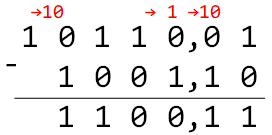 Сложение в двоичной системе счисления выполняется по тем же правилам, что и в десятичной. Два числа записываются в столбик с выравниванием по разделителю целой и дробной части и при необходимости дополняются справа незначащими нулями. Сложение начинается с крайнего правого разряда. Две единицы младшего разряда объединяются в единицу старшего.