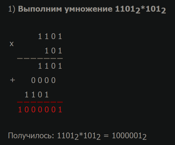 Аналогичная ситуация возникает во втором разряде, где с учетом двух перенесенных единиц получается число 5 = (101)2. 1 остается во втором разряде, 0 переносится в третий и 1 переносится в четвёртый.