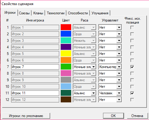Суть в том, что мне нужно, чтобы игрок, которым управляет играющий в карту человек был не стандартного красного, а тёмно-зелёного цвета. Также на карте присутствует противник зелёного цвета. Всё это можно легко настроить в редакторе через Сценарий/Свойства игрока. Я так и сделал. Вот картинка моих настроек.
