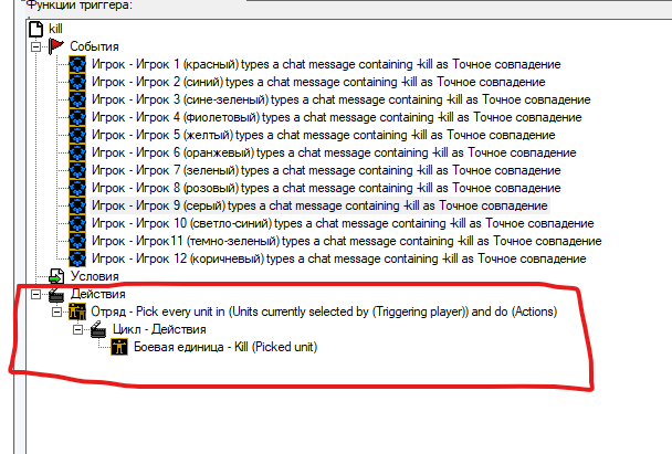 Простенький пример. Если нужно для большего количества игроков - то отлавливать номер игрока, который выделил юнита, чтобы после этого заносить выделенного юнита в массив, после чего если игрок под каким индексом напишет сообщение в чат "-kill", то чтобы данного юнита можно было найти под индексом игрока, отправившего сообщение.