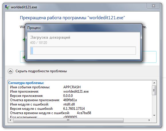 При совместной разработке появилась проблема: карта, которая нормально сохраняется и открывается у напарника не хочет открываться у меня. Оба используем Jass New Gen Pack 5d Exp2. Во время загрузки декораций происходит типичная ошибка Windows 7: