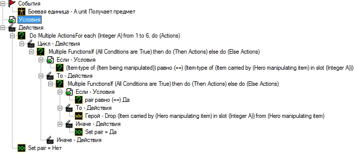 К сожалению, я нашёл лишь условие "количество предметов у юнита" о типе предметов, там нет и речиВерно, мой косяк. Надо циклом перебирать предметы. Вот карта с триггером и скрин:
