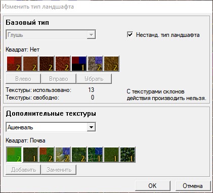 Вот что получилось: 'Odrt', 'Odtr', 'Osmb', 'Ofst', 'Oaby', 'Frok', 'Fgrd'. Всё что начинается с буквы "O" - это всё из типа Глушь. И их опять нет, но теперь в файле terrain.slk.