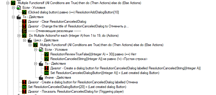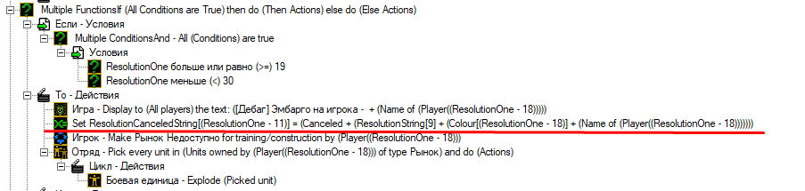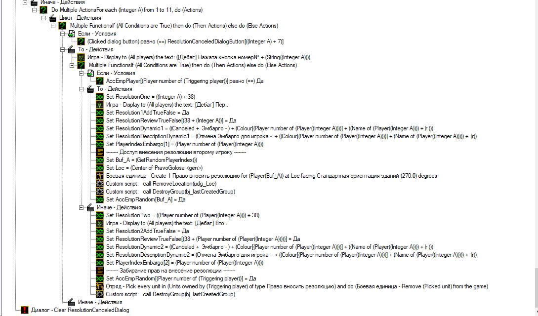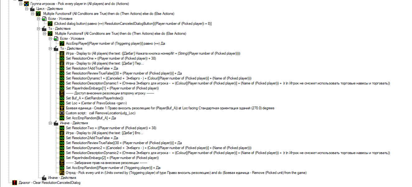 При успешном внесении эмабрго на игрока 1, кнопка с отменой исправно появляется в отменяемых резолюциях и надпись на ней правильная(отмена эмбарго для первого игрока). Но при нажатии кнопка обрабатывается неправильно, будто бы игнорируя 1 игрока и обрабатывается для 2 игрока (исходя из того что пишет [Дебаг] нажата кнопка №2, но может быть я ошибаюсь). Обработка представлена на скрин3