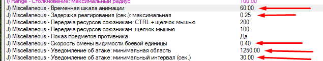 уведомление об атаке - как далеко должна быть камера от юнита, на коороогго напали, чтоб игра сказала, что войска вступили в бой. 1250 - значит ты должен смотреть на кого-то на расстоянии 1251 от юнита, иначе пиликать об атаке игра не будет. Поставишь 999999 - вообще не должна