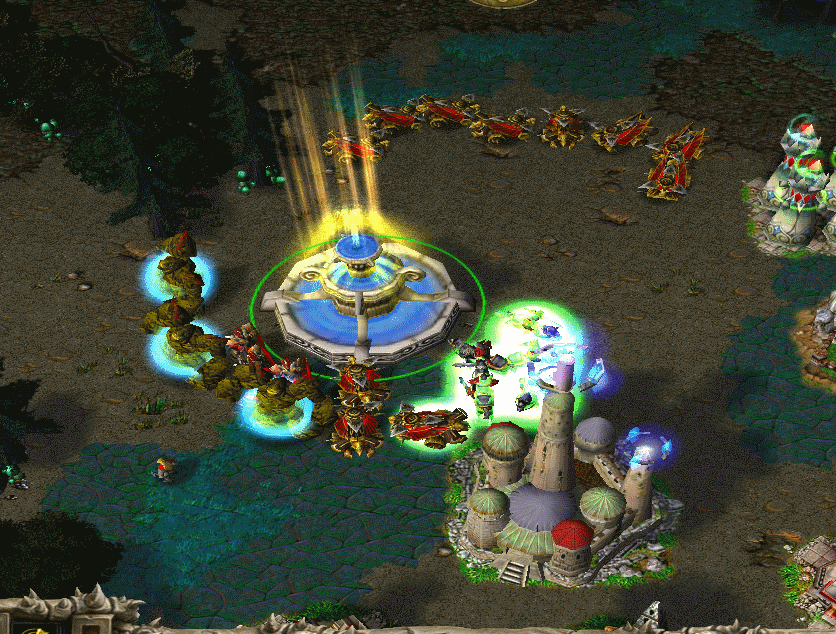 По идее там ничего сложного нет. Первый триггер при срабатывании способности объединяет нужное количество юнитов в радиусе действия в [массив], далее всех этих юнитов скрывает, а на месте каждого создаётся дамми с подходящей моделькой (судя по скрину, Волна Силы), которым тоже назначается переменная [массив], индексы массива дамми приравниваются индексам массива юнитов, на месте которых они созданы. Дамми вносятся в группу, которая получает приказ следовать к позиции кастера, после чего включается второй триггер. Второй триггер должен ловить приказ СТОП для юнитов в группе. То есть дамми не должны никак иначе сменить приказ, раз они москиты, лишь при достижении цели пути. Так вот триггер отлавливает приказ стоп у юнита в группе, мгновенно переносит на место москита соответствующего юнита из параллельного массива, делает его видимым, убивает этого москита и убирает из группы. Последним действием проверяется, что если юнитов в группе 0, то удалить группу и отключить триггер.