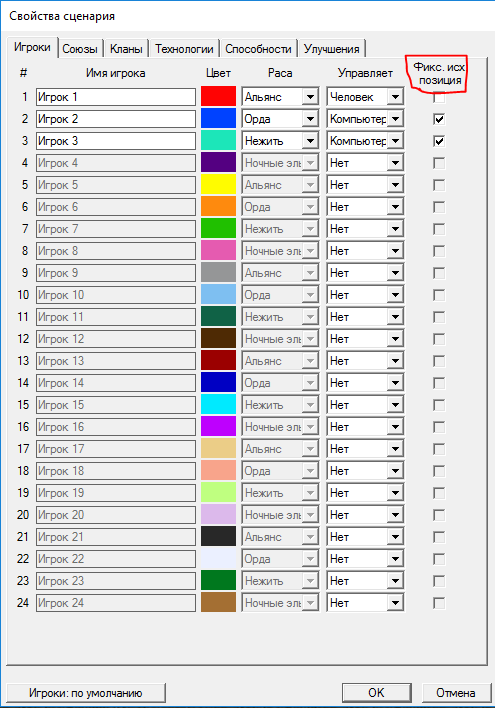 Свойства игрока - Кланы - Нестандартные кланы + Фикс. параметры игрока (ставим эти галочки и все будет работать).