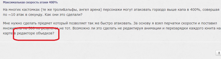 Мне нужно сделать предмет который позволяет так же быстро атаковать. За основу я взял перчатки скорости и поставил множитель на 500 но результат не тот. Возможно ли это сделать не редактируя анимации и перезарядки каждого юнита на карте в редакторе объедков?
