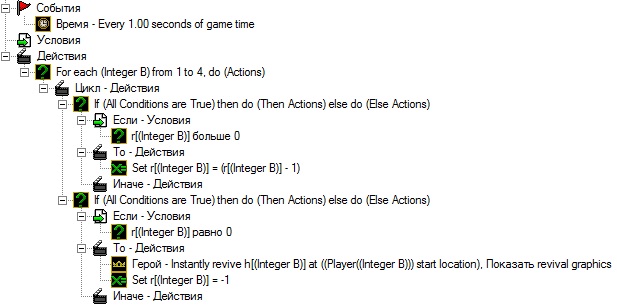 Тут у нас идет отчет времени (каждую секунду) до момента воскрешения (отчет записывается в таблицу, чтоб игроку было видно когда воскреснет герой), по завершении отчета, если переменная Т(номер трупа игрока =) ) равна нолю, и в то же время герой игрока еще мертв, то бежит к след. триггеру.