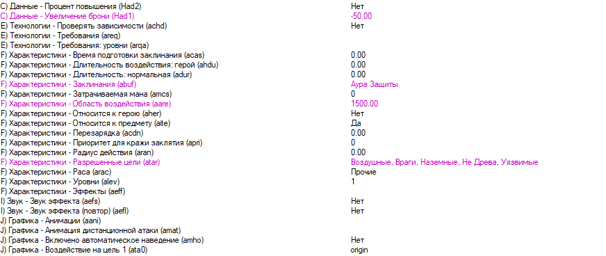 Доброго времени суток! всегда было интересно как снизить защиту врагов за счет ауры, за основу взял Доспехи веры которая повышает защиту и поставил - 5 ед сработало!, но она действует и на союзников, войск игрока и даже на врага. в РО есть Характеристики Разрешенные цели поставил air,enemies,ground,notself,neutral, на себя не действует но на союзников по прежде. у меня союзник это 11 игрок и 12 нападающий 1 2 3 4 и так до 10 это игроки.