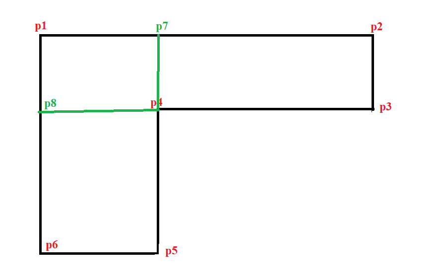 Вот пример уже имеются 6 точек p1-p6, могу найти p7-p8. Теперь надо как-то собрать ректы (на глазок понятно что там 3, а то и меньше 2). надо как-то написать алгоритм, что эти отрезки образовали ректы