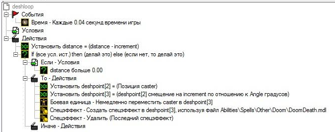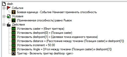 А вообще в том же триггере плодятся утечки точки. Грубо говоря, игра создаёт в памяти каждый раз точку при обращении к позиции юнита, даже если эта точка уже есть. Например, есть в движке игры установка называть все сохраняемые в памяти точки pos[номер], при выполнении триггера, где три раза упоминается позиция одного и того же юнита, в памяти будет создаваться не одна точка, а pos[1], pos[2] и pos[3]. То есть в триггере desh нужно поменять 2 (Позиция caster) на deshpoint[0].