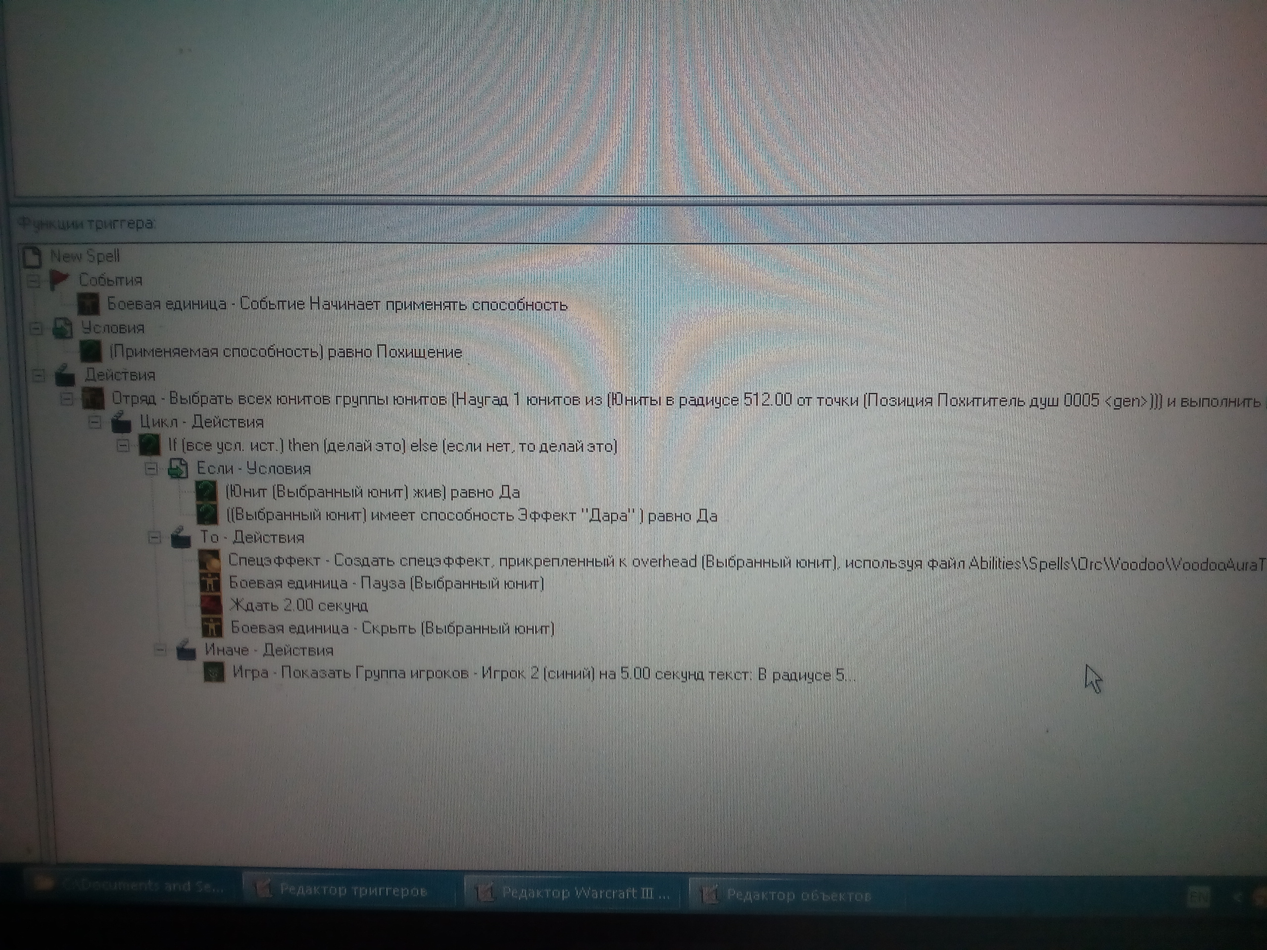 Во-первых, попробуй поставить событие Приводит способность в действие. Во-вторых, бафф Эффект "Дара" может на юните отсутствовать, если его накладывает способность, нужно какую-то минимальную задержку сделать. В-третьих, в действиях с группой нельзя использовать Ждать, но в данном случае выбирается лишь один юнит потому может работать, только сама реализация мне кажется неправильной, если способность похищает не случайного юнита, а конкретно того, на кого направлена, то есть же (юнит-цель способности) или как-то так.