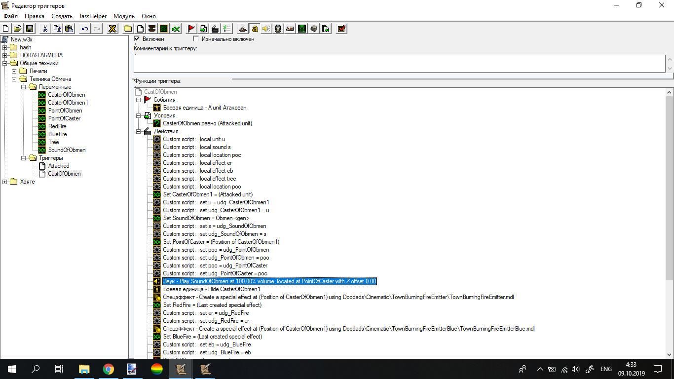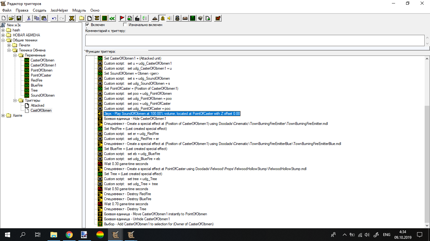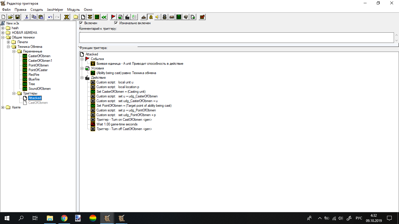 Есть два триггера, "CastOfObmen" включается и выключается в "Attacked".