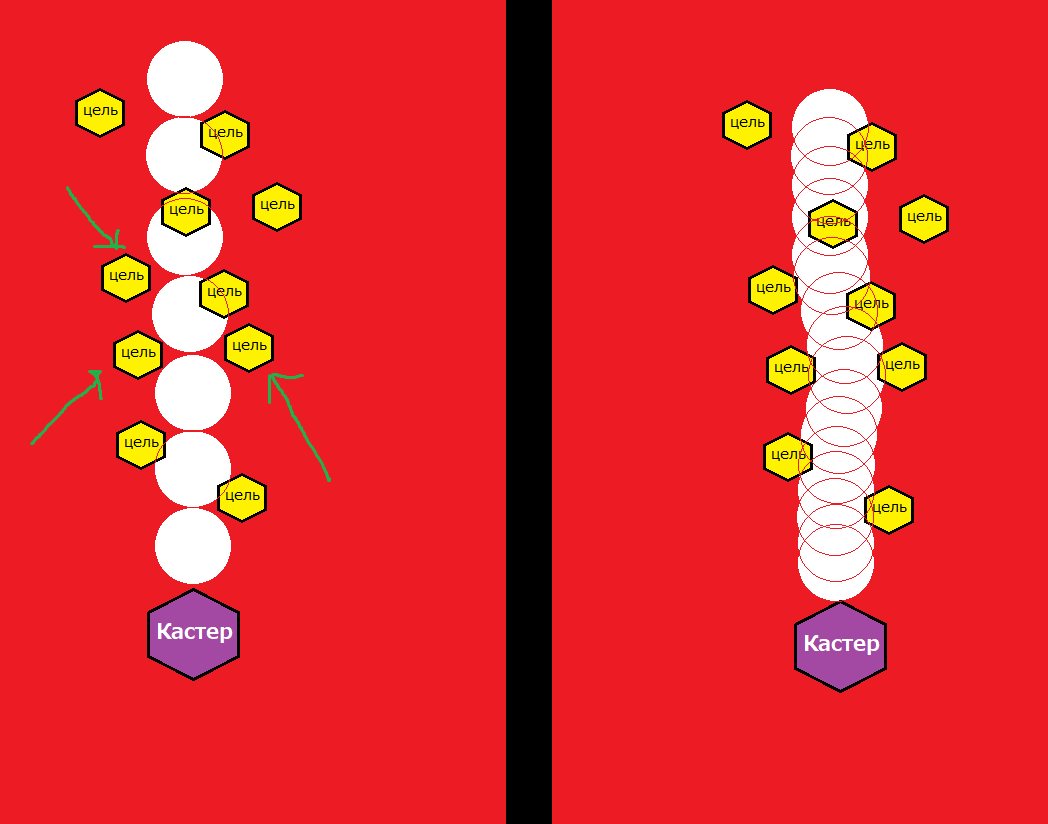 Четко, только не +100 +200, а + радиус в котором юниты будут получать уронЧтобы одновременно это очень просто, выбери толщину линии, подели на два и с таким радиусом наноси аое урон со смещениями вперед от героя в нужном напоавлении на +100, потом +200 и тд, в цикле