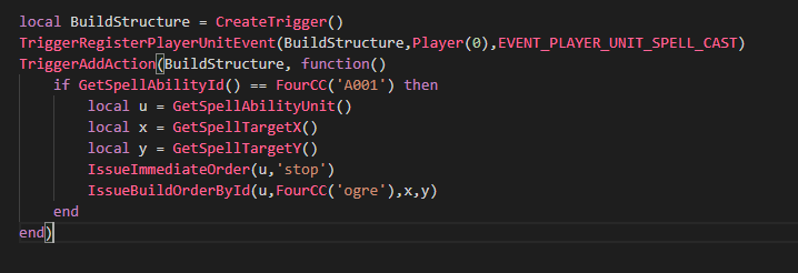Добавляешь рабочему необходимые постройки, отлавливаешь сработавшее заклинание и приказываешь ему строить здание в месте указания цели способности.