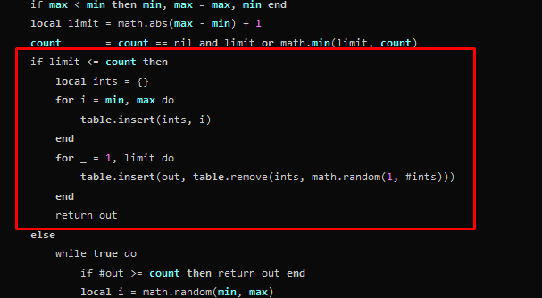 функция GetRandomIntTable(min, max, count) может работать как GetRandomIntTable(200, 100, 5) так и как GetRandomIntTable(100, 200, 5) или GetRandomIntTable(100, 200), работает так же и с отрицательными значениями
