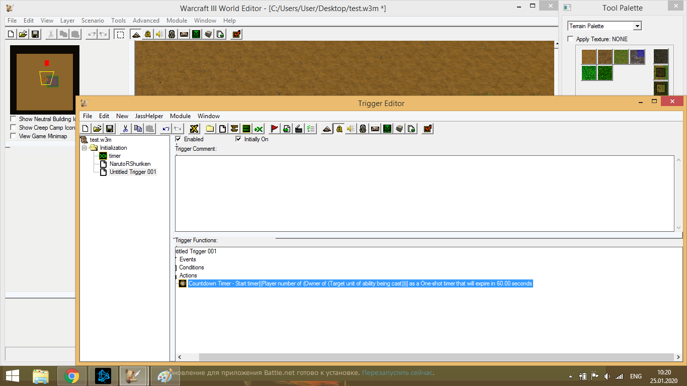 Обратный отсчёт - Start timer[(Playernumber (Target of ability being cast))] Однократный на 60 секунд.
