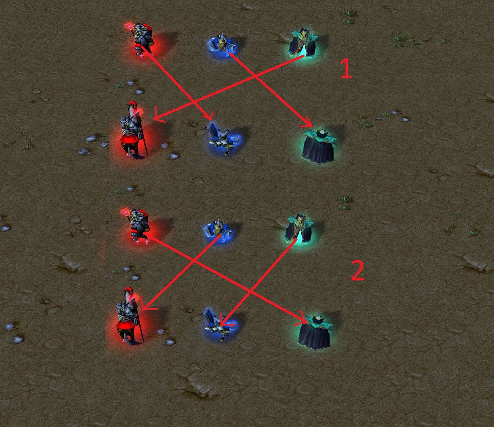 В общем такого характера проблемка. Все условно, не важно что это будет - юнит, integer, real, то есть от этого можно целиком абстрагироваться. Суть такая - есть 3 (4.5.6.7.8) условных боевых единиц и у каждой есть копия. Нужно чтобы копии пошли атаковать основных героев, но так, чтобы условная копия под номером 6 не пошла атаковать основного героя под номером 6 ни в коем случае. Для примера попытался изобразить на картинке.