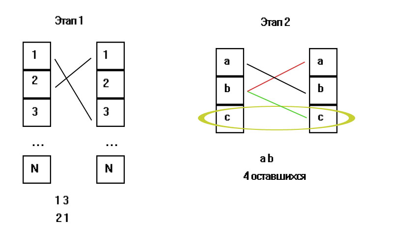 - если в ячейку i в результате обмена опять попало число с номером этой ячейки, делаем еще один случайный обмен (тут можно не делать дополнительную проверку на коллизию т.к. коллизия не может на этом этапе возникнуть повторно для этой ячейки)