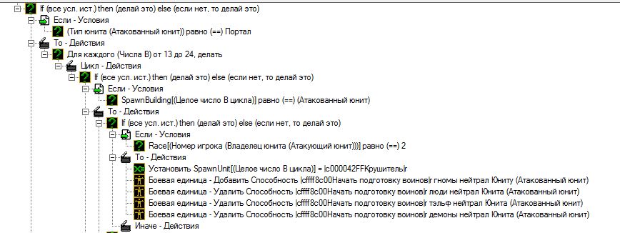 Попробую вкратце описать ситуацию. На карте есть здания, которые, чтобы захватить, нужно бить до 20% здоровья. Потом оно автоматически переходит к вам и полностью восстанавливается. Это легко и стабильно работает на всех зданиях (их около ста). но есть среди них 12, для которых к этому триггеру есть дополнение, в котором зданию выдается нужная способность, оно выглядит вот так: