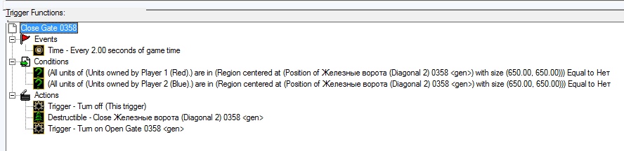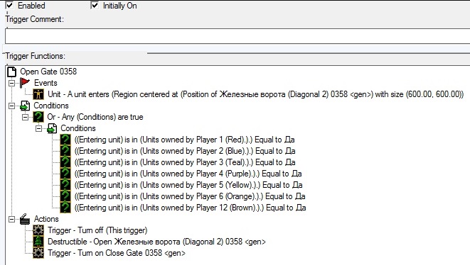 Например, в триггере где закрываются ворота, если нет рядом ни одного юнита принадлежащих игрокам, то ворота закрываются. Если галочка убрана, то условие проходит, юнитов игроков рядом нет и ворота закрываются, а если галочка стоит, то 1-е условие проходит, а 2-е условие, где проверяются юниты синего игрока, не проходят, ворота не закрываются, хотя этого игрока вообще нет в игре.