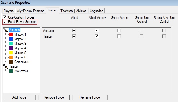 Почему то, если в Scenario Properties во вкладке Forces поставить галочку Fixed Player Settings, то некоторые триггеры начинают работать иначе.