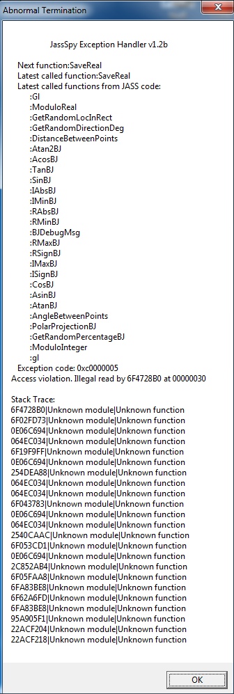 Версия Warcraft 1.26. Через 10-60 секунд после загрузки сохранённой игры карта вылетает с критической ошибкой. UnrealJassSpy не показывает ничего криминального в Jass функциях. Единственная странность, он пишет что вызывались функции (такие как GetRandomLocInRect, GetRandomDirectionDeg и другие) которых в коде карты нет.