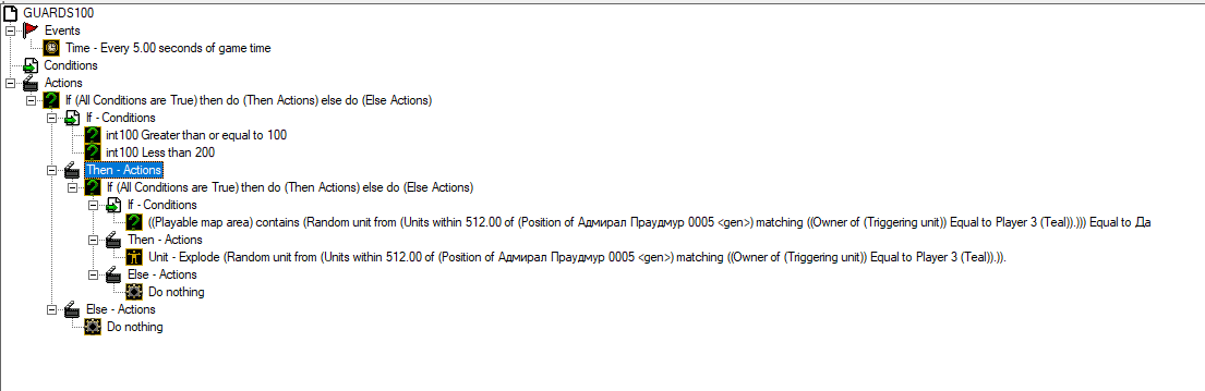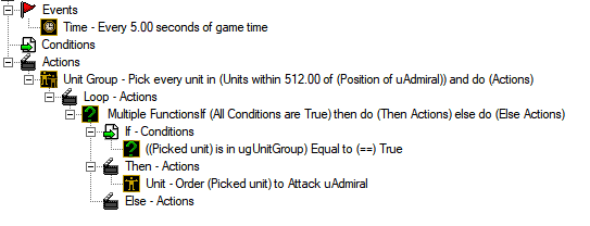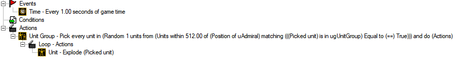 Далее можно добавлять любые проверки, например как проверить находится ли юнит из группы рядом с uAdmiral и выбирать случайного юнита из группы юнитов ugUnitGroup только если они рядом с ним (что бы не взорвать тех, кто еще бежит где то далеке)