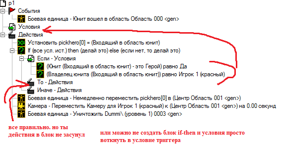 Qulore, добавить условие, что входят - герой. И владелец этого входящего юнита - красный итд. для каждого триггера изменяй в условии игрока.