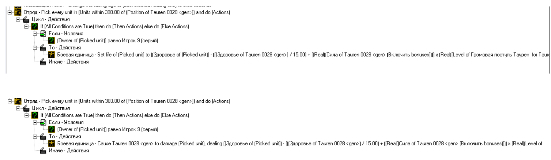 Триггеры абсолютно одинаковые за исключением того что в первом чистый урон наносится через Set Life of picked unit, а во втором через действие Damage Target of picked unit с помощью урона типа Заклинание
