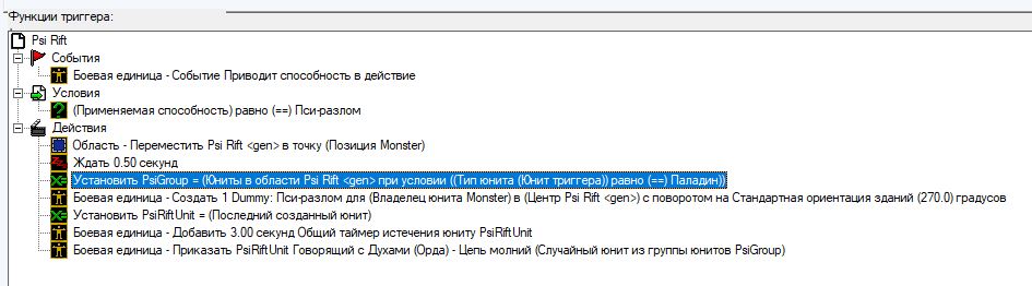 Сделал триггер, работающий следующим образом: Безликий кастует способность, к нему перемещается область (точнее, под него), в этой области герои (или нейтральные юниты, или все вместе, как повезёт) выбираются в отряд, затем появляется dummy-пехотинец и бьёт случайного героя (или нейтрально-враждебного, как повезёт) "цепью молний", переменная отряда обнуляется. Всё. Проблема в том, что я без понятия как засунуть героев в отряд-цель. Я уже и Безликого в исключения ставил (юнит не равно безликий), и конкретного игрока целью делал (юнит триггера принадлежит игрок синий) , и героя отдельного целью делал, а оно не в какую. Там явно как-то хитровыверенно нужно ставить, о котором я не знаю.