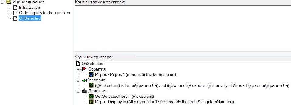Всем привет. Вернулся к копошению в редакторе после долгого перерыва и решил начать с малого: заставить союзных героев выбрасывать указанный мной предмет(раздражает когда бот у тебя ворует предметы). Все казалось мне предельно простым - сделать 2 триггера, в первом мы отлавливаем события выбора юнита игроком и проверяем, что это герой союзника, заносим выбранного юнита в переменную. Второй тригер - отлавливаем событие ввода текста игроком и вычленяем в введенной строке подстроку, из которой берем номер предмета в инвентаре союзного героя, который тот должен будет выбросить. Заносим в переменную. Затем собственно приказываем герою выбросить этот предмет. Второй триггер работает как надо, а вот первый почему то нет. Сам триггер: