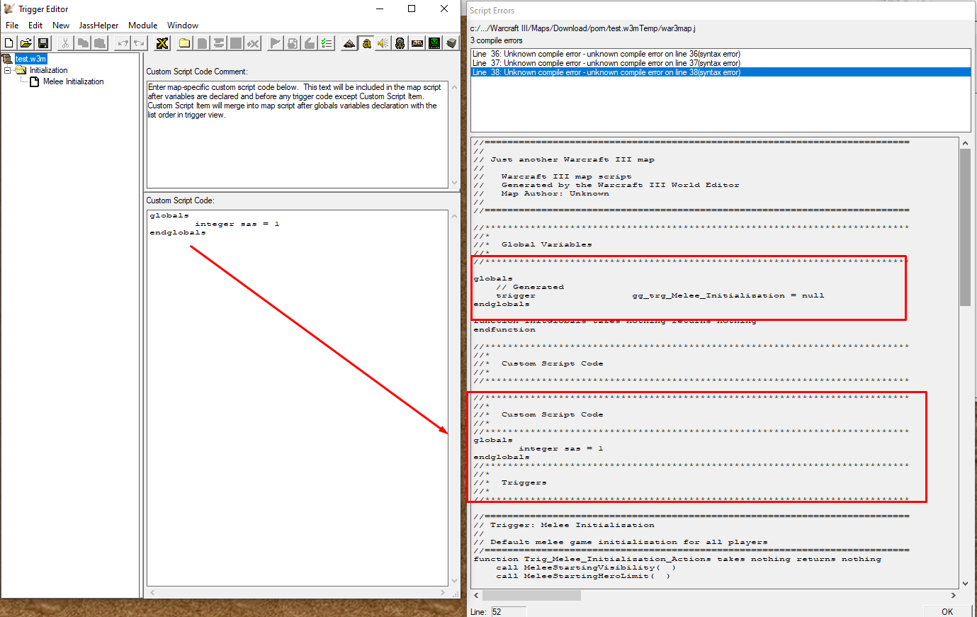 при сохронение карты нужно выключать галку JassHelper>Enable vjass в выпадающем меню инфу нашол на хайве, спасибо мне : -) и спасибо rsfghd за то что было не пофиг. вот ссылка на топик с проблемой www.hiveworkshop.com/threads/simple-reforged-we-questions-for-vj...