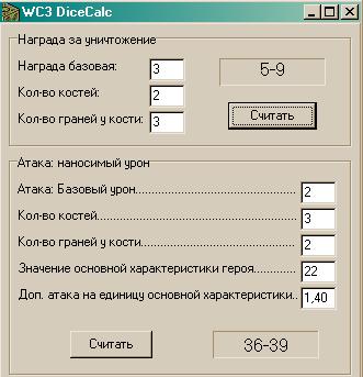 Интерфейс прост до безобразия, да к тому же и на русском языке. Как видно из скрина - 2 самостоятельных блока - для расчета выбиваемого золота и для расчета наносимого урона.