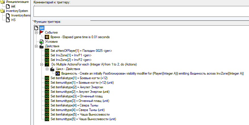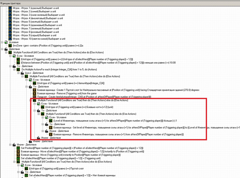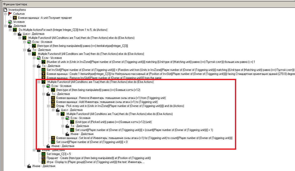 Теперь добавим эффекты от поднятого предмета. Сделаем при поднятии "Боевых Когтей" +12 к атаке. Для этого надо создать способность или копировать существующую, так как у нас инвентарь на 25 слотов то делаем ей 25 уровней и создадим переменную массив "count" .Добавим в первый триггер конструкцию выделенную красным: