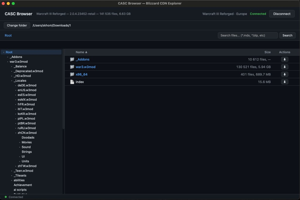 CASC Browser - это настольное приложение для просмотра и загрузки игровых ресурсов из CDN Blizzard (CASC - Content Addressable Storage Container).
